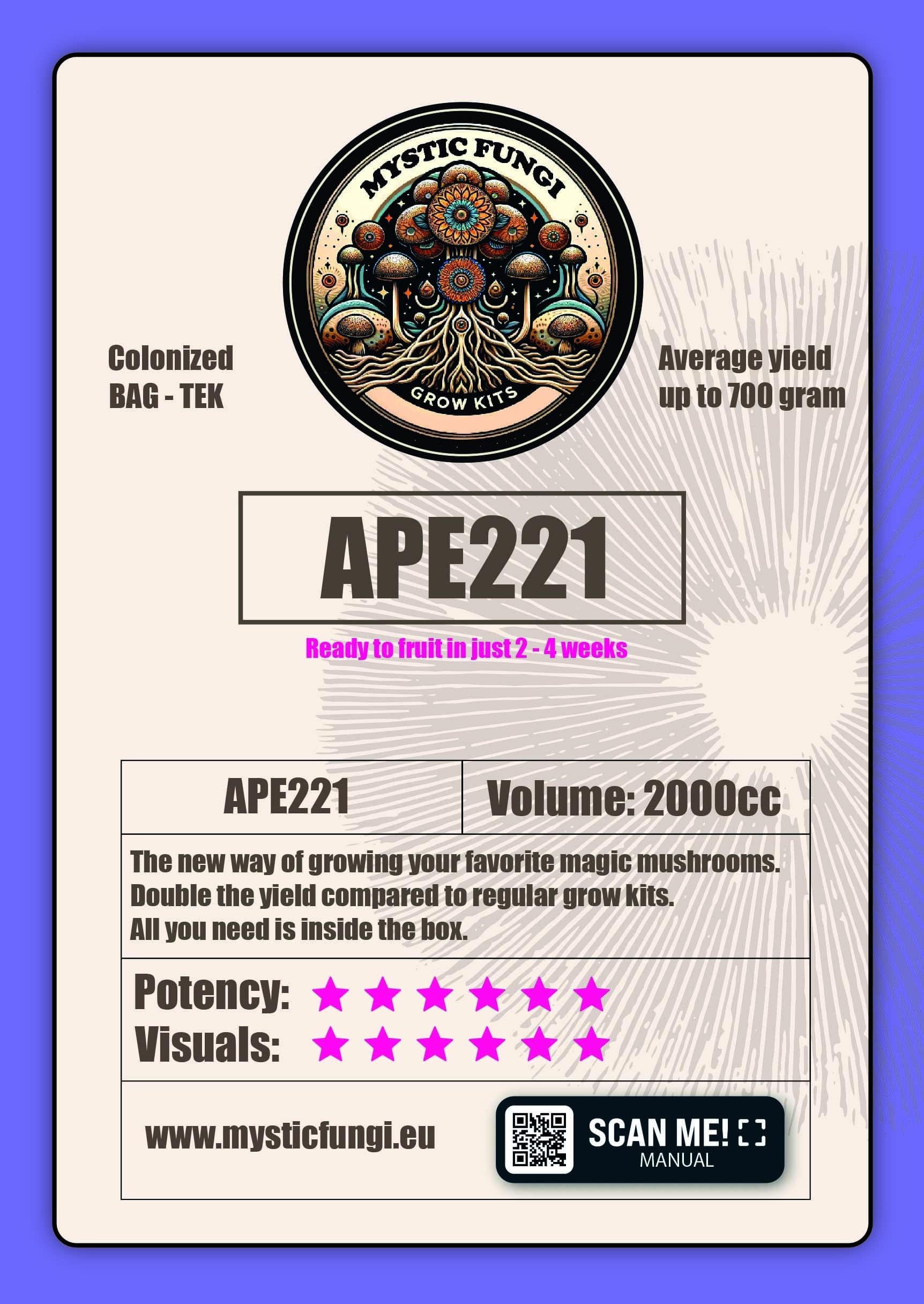 Das Growkit besteht aus einer stabilen Zuchtbox mit vollständig durchwachsenem Substrat, das mit dem APE221-Stamm von Psilocybe cubensis beimpft ist. Zusätzlich enthält das Set einen Zuchtbeutel und einen Clip zum Verschließen des Beutels.