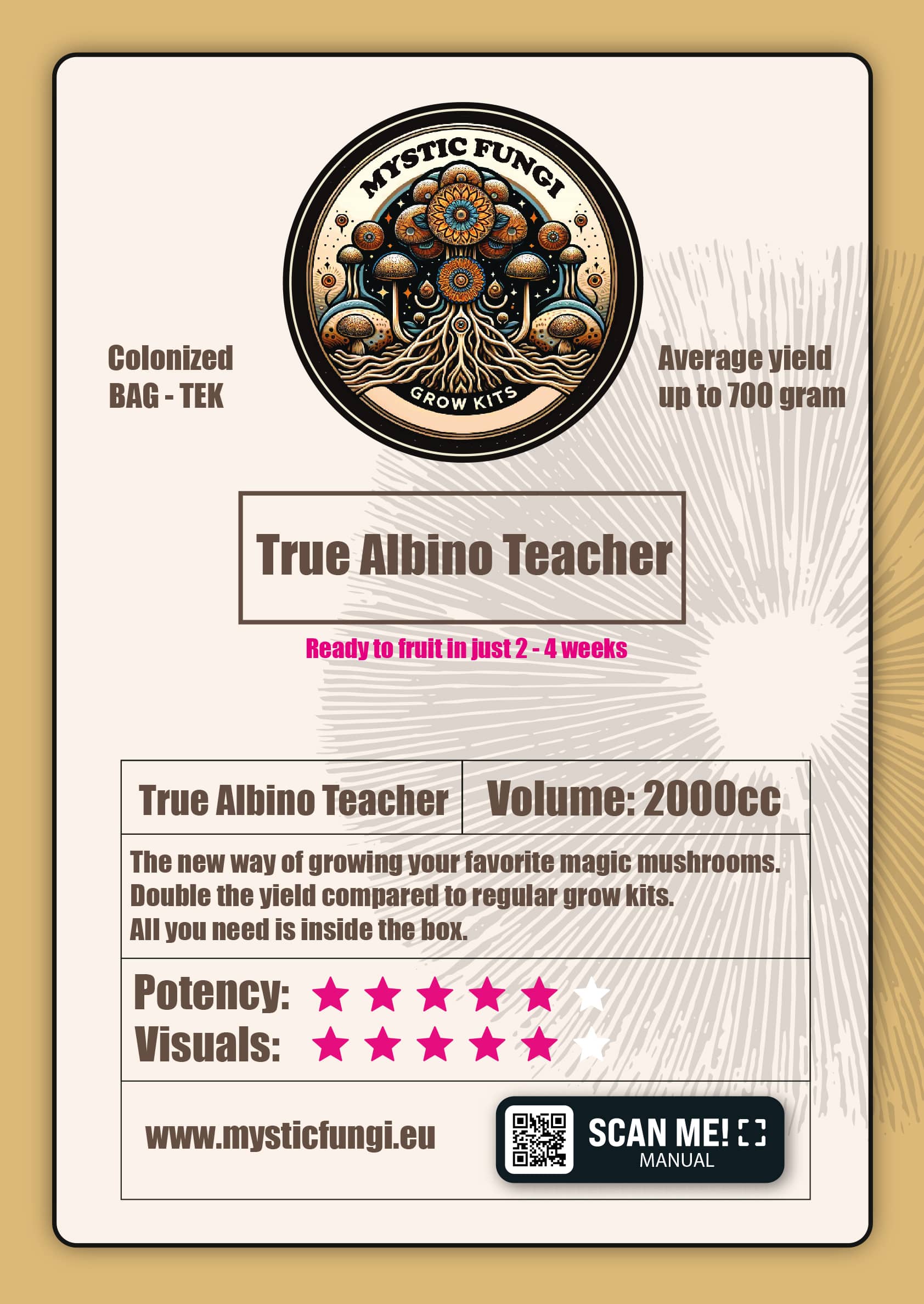 • True Albino Teacher’s strength ranges from slightly above average to considerably strong. In this respect, it is similar to the Golden Teacher, but stronger. However, the trip effects themselves are similar to those of other Psilocybe cubensis species.