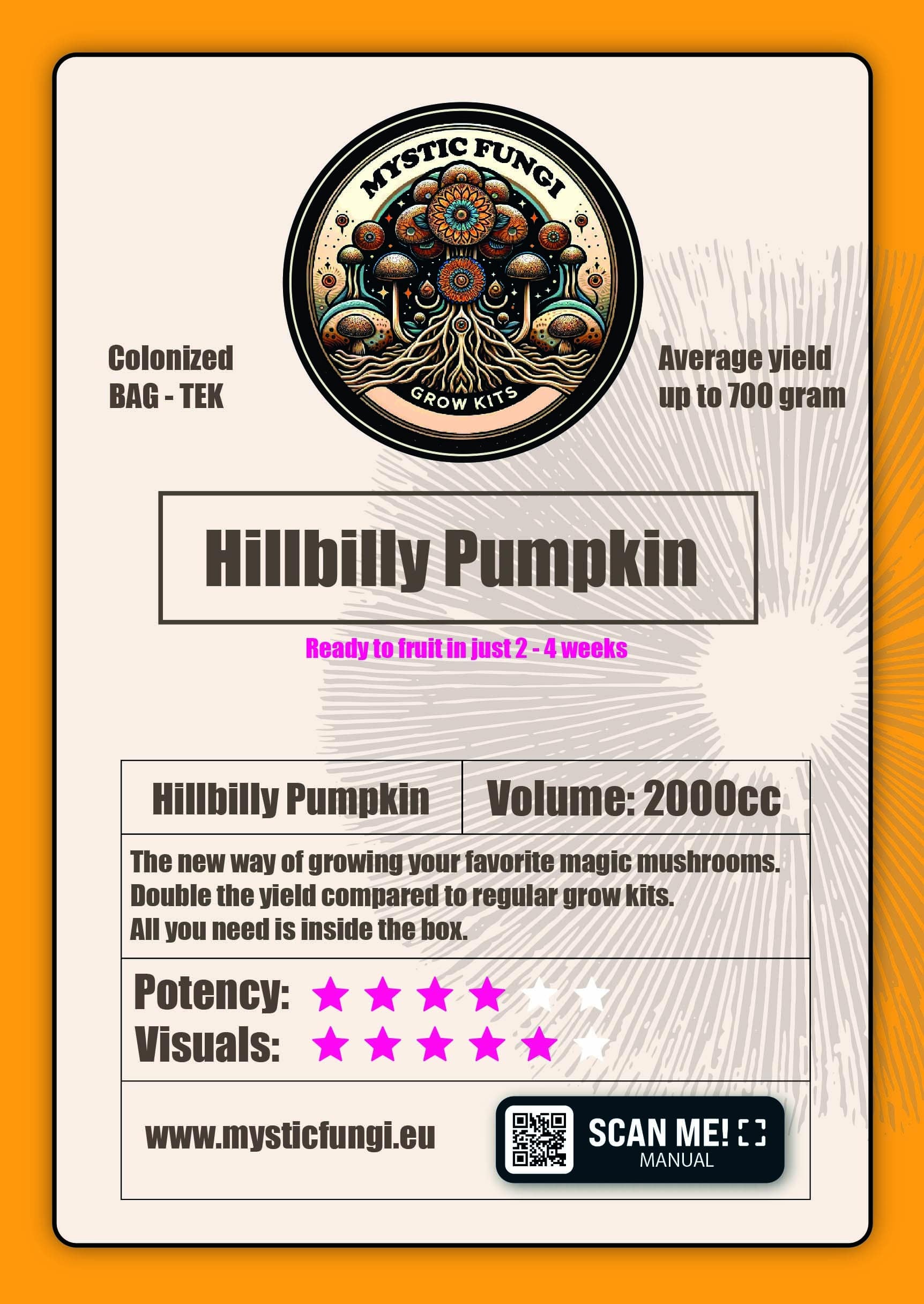 Il kit di coltivazione contiene un substrato appositamente formulato che è completamente colonizzato dal micelio dell’Hillbilly Pumpkin (Psilocybe cubensis). Il substrato è confezionato in una vaschetta di coltivazione appositamente progettata. Inoltre, vengono forniti un sacchetto di coltivazione con filtro e una clip riutilizzabile per sacchetto.